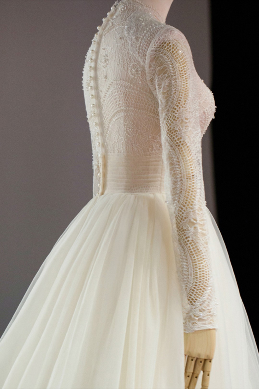The aire wedding dress is made of airy chiffon and embroidered lace.
